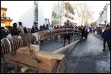 Stockachs Zimmerer haben den Narrenbaum-Umzug in Singen zum Erliegen gebracht: Ihr Narrenbaum war zu groß. Er kam nicht um die Hausecken. |