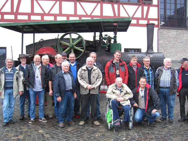 Zur morgendlichen Begrüßung der Ausflügler in der Zunftschüür wurden Schmalzbort und Schwarzwurst von den Rebwiebern Bettina Kraus und Barbara Waibel serviert. Da die Mengen ausreichend dimensioniert waren, wurden die Reste den ganzen Tag von Bettina zur Verköstigung anpriesen. Die Damen wechselten nach dem Imbiss die Serviertabletts mit den Lenkrändern der „Berg-ruft-Shuttlebusse“ vom Autohaus Bach und chauffierten die Hallenböcke mit rasantem Tempo zum Traktormuseum Bodensee in Gebhardsweiler bei Uhldingen-Mühlhofen. Kurzen Stopp machte ein Bus beim Altenheim St. Anna, um unseren „Schikanör“ Wolfgang Wermuthäuser mitzunehmen. Der erste Eindruck am Ziel war überwältigend. Auf einer schönen Anhöhe mit Blick auf den Bodensee befindet sich das weitläufige Areal des Jägerhofes. Der riesige, moderne und fachwerkliche Gebäudekomplex, der erstmals im Frühjahr 2013 seine Pforten öffnete, lud trotz leichtem Nieselregen zum Verweilen ein. Auf über 10.000 Quadratmetern kann man im Traktormuseum Bodensee die Mechanisierung und Motorisierung der Landwirtschaft von den Anfängen bis heute an Traktoren aus Europa, USA, Südamerika und Australien miterleben. Während andere Museen immer moderner und futuristischer gebaut werden, hat der Gründer Dr. Gerhard Schumacher in Uhldingen-Mühlhofen etwas Außergewöhnliches geschaffen: Im bäuerlich-ländlichen Ambiente sind nicht nur Traktoren zu sehen, sondern auch viele Dinge, die zum ländlichen Leben der letzten 100 Jahre gehören: viele Werkstätten alter Handwerke wie Hufschmied, Schuhmacher, Drexler oder eine alte Schule, ein Spielwarenladen, ein Haushaltsgeschäft, eine Wäscheküche mit vielen Geräten zum Thema Wäschen und Bügeln usw. Der ganze Museumsbereich ist mit alten Baumaterialien wie Balken und Pflastersteinen, historischen Türen und Toren aufgebaut. Man fühlt sich in ein Dorf in alte Zeiten versetzt. Durch die Vielzahl der Exponate ist die Ausstellung für alle Besucher interessant und lohnenswert. Mit über 150 Traktoren und Fahrzeugen aus der gesamten Entwicklungsgeschichte der Schlepper und Landmaschinen sowie den detailreich nachempfundenen Werkstätten alter Handwerkskunst, vergeht der Tag für den Besucher wie im Flug.
