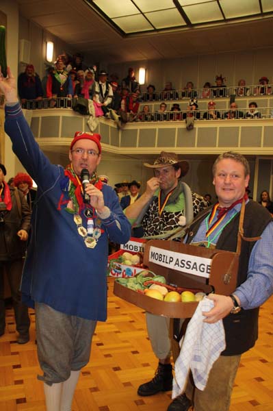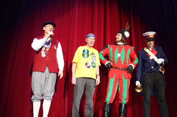 Es donnerte und blitzte gewaltig und furchterregend. So manchem blassbleichen Narren stand der Angstschweiß auf der Stirn, als exakt um 11.25 Uhr der Poppele bei düsterem Kerzenlicht mit Peitsche bewaffnet aus seiner Gruft stieg. Dabei hatte der gute Geist doch nur eines im Sinne: Den Gleichgesinnten jene Narrenkappe aufzusetzen, die er seit Aschermittwoch streng und geheim versteckt hielt. "Aber nur bis über die Ohren, sonst geht der Geist der Fasnet verloren", mahnte er die anwesenden Narren, die sogleich taten wie ihnen geheißen. "Die Kappe ruiniert meine Frisur", ächzte Zunftmeister Stephan Glunk und wollte damit, so ein beißender Kommentar eines Gastes mittleren Alters, nur dezent davon ablenken, dass ihm der ausfallende Rückgang selbiger seit Jahren diverse Probleme bereitet. Zeugmeister Ali Knoblauch beschäftigte sich intensiv mit dem närrischen Rückblick. Er stellte der Stadtverwaltung die Gretchenfrage: "Habt Ihr mit voller Kraft etwa nichts gemacht?" Alsdann kam er zu dem weisen Schluss: "Wer nix schafft, macht nix verkehrt." Er grüßte Sheriff Peter, jene Zivilstreife, die auf Stahlross Rosinante gegen falschparkende Windmühlen ankämpfte. Überraschend kam Ali angesichts der sommerlichen Straßensperre zwischen Friedingen und Hausen zu dem Schluss: "Wenn sie jetzt wegen Rindviechern sperren jeden Straßenverkehr, sind in Singen bald alle Straßen leer." Die Spannung stieg ins Unermessliche, als Ekke Halmer zielsicher und durchaus gekonnt das Motto für die Fasnet 2012 verlas: "S duet's scho no." Doch bereits am 11.11.11 zeichnete sich am Horizont der heraneilenden Fasnet 2012 ein tiefgreifender Konflikt ab, der seit jeher die Menschheit entzweit: Was meint Mann, wenn er das Motto ausspricht – und was meint Frau, wenn sie das Motto ausspricht? Alles eine Frage der Betonung, so Ekke: multifunktional sei der Spruch, er habe jederzeit und jederorts Gültigkeit. Beim Manne jedoch sei er verharmlosend gemeint und mit der Absicht verbunden, am Status Quo ja nichts zu ändern. Beim Weibe jedoch sei er eine unmissverständliche Aufforderung, sofort stehenden Fußes eine Änderung herbeizuführen. Ein Narr, wer Böses dabei denkt. Angesichts der Abschaffung der Unechten Teilortswahl sah sich Zunftmeister Glunk zu folgender Aussage genötigt: "Bei uns geht's nur echt zu!"