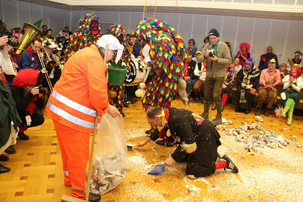Kehraus mit Scherben im Ratssaal Poppele übernahmen die symbolische Macht mit manchem Hintersinn Eine Menge Müll musste Singens neuer OB Bernd Häusler bei seiner ersten Entmachtung am Schmotzigen Donnerstag durch die Poppelezunft wegräumen. Und damit wurde der traditionelle Kehraus zur Fastnacht gleich schon mal auf den Start in die Singener Fasnet vorverlegt. Sogar einen Scherbenhaufen als sinnbildliche Folge der aktuellen GVV Diskussion musste Bernd Häusler gegen eine Stoppuhr aufkehren, nachdem ihm die Mitarbeiter des Poppele-Bauhofs schon Papier, Konfetti und das Stroh der »Hoorigen Bären« hingeworfen hatten. In Singen müsse eben einfach noch viel aufgeräumt werden, befand der Zunftmeister, der natürlich schon lieber für eine Woche die Macht symbolisch im Rathaus übernehmen wollte, denn die Singener Baugestellschaft ist dann doch ein heißes Eisen, das jetzt nach der Narrenzeit lieber weiter abgekühlt werden soll. Für den neuen Singener OB wurde so seine erste Entmachtung gleich zur sportlichen Prüfung - wie schon die ersten Monate seiner Amtszeit. Doch Häusler hatte schon im Vorfeld den Singener Narrenchef ins Boot geholt: Er schlug nämlich vor, dass doch Poppele- Zunftmeister Stephan Glunk der neue Bürgermeister in der Stadt werden solle, dessen Stelle nun real ausgeschrieben wird. Glunk nahm auch zur Probe schon mal Platz neben Häusler, um das Amt mal zu testen. Häusler konnte gleich auch sein Leid über manche Medien klagen: »Wenn du was sagst, heißt das, du hast eh gelogen. Wenn du nichts sagst, hast du garantiert betrogen. Und hältst du dich vornehm zurück, dreht sie dir einen anderen Strick.« Die Poppeles kündigten indes schon einen politischen Umbruch für die Zeit nach der Wahl an. Denn Burggeist Popolius, das Eierwieb, der Narrenpolizist wie auch Narrenmutter und Narrenvater kandidieren für den Gemeinderat. Sie hatten sogar schon ihre Wahlplakate mitgebracht, die sie über den Köpfen der versammelten Narrenschar schwenkten. Das war dann wieder närrischer Ulk, obwohl sie sicher einiges an Stimmen bekommen würden, ist sich auch Glunk sicher. Die Fraktionen bekamen auch dieses Jahr die Chance zur Verteidigung vor ihrer Absetzung: Die CDU versuchte sich in Reimen, die Angst vor dem papierlosen Gemeinderat und weiter vor einem Kontrollverlust in der Klinik-Holding prägte ihre Verse. Die SPD stimmte das Lied vom »Roten Milan« an und wusste ganz viele Stellen, an denen in der Stadt so viel Wind gemacht werde, dass sich ein Windkraftwerk durchaus lohnen dürfte.